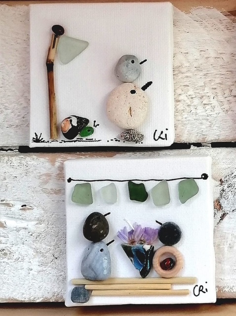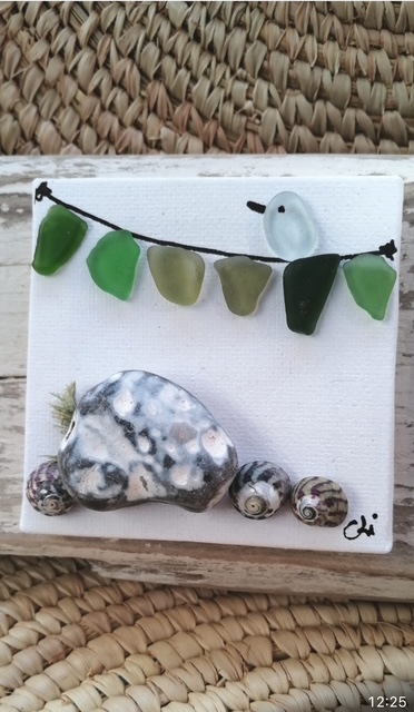 Christel vous emmènera dans son univers plein de poésie en vous faisant réaliser un mini-tableau avec des coquillages, des galets et autre matériaux